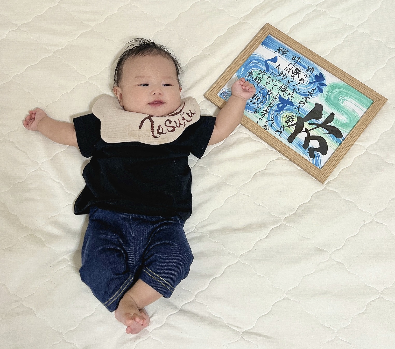 お客様のご要望:お名前の由来や想いを伺い、名前詩に込めました。スタイにはお名前を直筆で入れました。